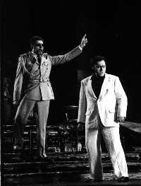 Auch die Kostüme lehnen sich an die heutige Zeit an. Die Soldatenuniformen erinneen schwach an die Bundeswehr, obwohl dies wohl nicht symbolisch zu verstehen ist, und Arrigo kommt im Smoking zur Hochzeit. Angesichts der politischen Ereignisse der letzten Jahre - Balkankrieg ! - wirkte diese Transponierung in die heutige Zeit auch in keiner Weise aufgesetzt sondern jederzeit realistisch. Ein besonderes Lob ist dem hervorragend geführten Chor zu zollen, der hier nicht nur singt, sondern sich als Bevölkerung und Soldaten auch in hohem Maße in die Handlung einfügen muss, was zwar teilweise das Singen schwieriger macht, die Inszenierung jedoch außerordentlich bereichert und ihr Dynamik verleiht. Das Publikum belohnte die Akteure einschließlich dem von Hans Drewanz sehr exakt und nie dominant geführten Orchesters mit begeistertem Beifall, in den sich viele Bravo-Rufe und - unverständlicherweise - auch einige Buh-Rufe mischten. |