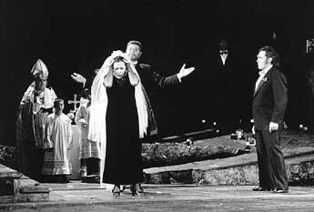 A Vivid, Old Fashioned Dramatic Interlude By Ellen Kohlhaas DARMSTADT. Abraham Mendelssohn once claimed he was only the son of a famous father and the father of a famous son. Connecting links like him, whether in gifted families or in the history of music, always have trouble gaining recognition. Giuseppe Verdi's "Sicilian Vespers" (Vespri Siciliani ) is a case in point. Originally composed as a French-style Grand Opéra in the tradition of Rossini and Meyerbeer, complete with the statutory choral pageantry and ballets, it turned out to be more of an erratic interlude between the successful Italian operas "Rigoletto" and "Il Trovatore" on the one hand and "A Masked Ball" and "Don Carlo" on the other. Even today, the Vespri Siciliani still tend to be measured against what came after them and hence dismissed as lightweight fare: Guido de Monforte's long monologue about loneliness at the beginning of Act III is thought to lack the depth of King Philipp's soliloquy on the same subject in Don Carlo, and the ball in Act III is often viewed as a mere precursor of the fatal finale of a Un ballo in maschera. The only parts of the Sicilian Vespers to have been spared such censure are the overture, the half-hour "Ballet of the Seasons" performed at the residence of the French occupiers and O tu, Palermo, the opening aria of the Sicilian revolutionary, Giovanni da Procida, which is now a standard item in the bass repertoire. That Verdi's 19th opera, first premiered in 1855, is nevertheless worth seeing, despite a certain amount of schematizing in both Eugène Scribe's libretto and Verdi's score was proved by the Court Theater of the Grand Duke in Darmstadt, where this monumental, five-act drama, had its German premiere on March 14, 1857. Although the long ballet interlude was omitted in the production now playing at Darmstadt's State Theater, the ball in Act III and fateful marriages in Acts II and V provided plenty of scope for folkloric dance numbers. The authenticity Verdi injected into his account of the Sicilians' uprising against their French oppressors on March 30, 1282, however, was both enhanced and held in check by Friedrich Meyer-Oertel's directing. In addition to the pure show -- value of some scenes, for which credit is also due to Hartmut Schörghofer's stage set with its moving partitions and interesting perspectives, the production was also punctuated by some barely controlled crowd scenes and a lot of stereotypical posing by the four main characters. This was all the more regrettable given that the director took the characters' personal predicament as the starting point for the political events -- namely the Duchess Elena's vacillation between her desire to avenge her brother's murder by Monforte and her love of Arrigo, who is himself unable to choose between his patriotism, his love of Elena and his devotion to his father, Monforte. The Governor of Sicily, a sinister schemer, demonstrates a capacity for cruelty as well as a yearning for humanity, both for himself and for the world of politics, while Monforte wins us over once we realize that most of his diplomatic maneuverings are for the sake of his illegitimate son, Arrigo. Only Procida is sufficiently fanatical to hold all things human in contempt, and it is this fanaticism that ultimately discredits the entire rebellion. Yet the governor is the only member of the cast to acquire an individual stature in the course of this production. Meyer-Oertel chose to draw out the understated infamy of the intellectual, who breaks out of his isolation only by virtue of his inhumanity. With his extraordinarily versatile and expressive baritone, Anton Keremidtchiev was undoubtedly the ideal man for this ambivalent role, just as Peter Klaveness, with his recalcitrant, gravelly bass, made a pleasing Procida. The problems, however, began with Paola Romano, whose tremulous soprano made an unconvincing Elena, just Gustavo Porta, who sang the tenor part of Arrigo sounded either strained or -- in the piano passages -- merely flat, besides making far too much use of sobbing portamenti. Not until their brief moment of illusory happiness just before the glaring massacre with which Verdi puts a rather too abrupt end to an otherwise highly varied drama, did these two performers, having apparently shed their opening-night nerves, pull off a somewhat more pleasing exit: In Elena's almost Bolero-like Siciliana Mercé, dilette amiche (Thank you, dear friends), Romano managed to control her voice sufficiently to produce some more or less transparent coloratura while Arrigo's La brezza aleggia intorno (The wafting breeze) sounded astonishingly relaxed. In addition to Anton Keremidtchiev and the powerful choirs provided by the opera houses in both Darmstadt and Mannheim, all of whom Wilhelmine Bauer dressed in 1930s-style uniforms and attire, the orchestra performed the most convincingly in this celebrated premiere. Right from the first, menacingly quiet and hesitant bars of the overture, it was clear that the orchestra conducted by Hans Drewanz would be drawing out the subtler nuances of the score in an instrumental texture as smooth as it was luminous. Not that Drewanz, who conducted this orchestra for three decades before retiring in 1994, ignored the more blatant gestures. But even here, the effect was buoyant rather than crushing and never once did he allow the orchestra to upset the delicate balance between the instrumentalists and singers. This sensitivity to the vocalists on stage while still being rigorously true to the score is a rare gift indeed in an age in which volume increasingly takes precedence over variation -- even in the pit. The next performances are on March 13, 14, 25 and 30. © Frankfurter Allgemeine Zeitung 2000 |