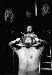 In dieser Oper wird ein Schriftsteller - also ein Intel- lektueller - mit dem programmatischen Namen "Ich" aus nicht näher erläuterten Gründen von der Gesellschaft gezwungen, einen Idioten aus dem Irrenhaus bei sich aufzunehmen. Geradezu freudig nimmt er diese Strafe auf sich, da er sie einer von ihm unter- stützten Idee (oder Utopie) zu schulden meint. Die Vorhaltungen seiner eher auf die Normalität der häuslichen Verhältnisse bedachten Frau wischt er beiseite. Er sucht sich den zwar etwas monströ- sen, jedoch scheinbar gutmütigen Wowa aus. Spätestens hier ahnt der historisch bewanderte Zuhörer die Botschaft, da Wowa auch Lenins Kosename war... Wowa fügt sich anfangs brav in den Haushalt ein, trägt jedoch zur Unterhaltung lediglich das Wort "Äch" bei, eine Verballhornung von "Ich", womit er sozusagen den Hausherrn spiegelt und karikiert. Doch bald beginnt Wowa "auszurasten", räumt Küche und Badezimmer aus, verteilt seine Exkre- mente in der Wohnung und zerreißt die Proust- Sammlung der Ehefrau. Letztere Handlung symboli- siert Regisseur Friedrich Meyer-Oertel sehr schön an Hand einer "echten" Proust-Figur (Werner Volker Meyer), die Wowa aus dem Bücherschrank zerrt und durch die Wohnung schleudert. Damit nicht genug, vertreibt Wowa das Ehe- paar aus dem Schlafzimmer, vergewaltigt die Frau, die sich daraufhin in ihn verliebt (!), schwängert sie und enthauptet sie schließlich mit einer Gartenschere, als sie sein Kind abtreibt. Dann verschwindet er. Der mittler- weile dem Wahnsinn verfallene Ich sitzt nun seinerseits im Irrenhaus und singt immerfort das Lied von der einsamen Birke, die im Feld steht. Die metaphorische Aussage dieses Werkes liegt auf der Hand: Wowa ist das Böse der Ideologie, der gerade die Intellektuellen im Glauben an eine verklärte Utopie verfallen. Wie in "Biedermann und die Brandstifter" werden alle Anzeichen des Bösen, des Chaotischen und der Zerstörung ignoriert, bagatellisiert oder schöngeredet. Nur das Eingeständnis des eigenen Irrtums will dem Intellektuellen nicht über die Lippen. Rings um ihn redet die Um- welt auf ihn ein: die Partei, die echten und vermeintlichen Freunde, Fremde und Kollegen. Diese Rolle übernimmt in der Darmstädter Inszenierung der Chor, der meist in düsterem Schwarz auftritt, der Farbe der radikalen politischen Ideologen. Die Frau als Symbol des Bodenständigen behauptet sich anfangs noch gegen den Einfluss des Idiotischen Prinzips, verfällt jedoch schließlich selbst dem erotischen Reiz der Gewalt. Die Intellektuellen einer solchen Gesellschaft, unfreiwillig Förde- rer des Unheils, verstehen bis zum Schluss nicht, was vor sich geht, und fallen in die Bedeutungslosigkeit. Diese letzte Szene karikiert damit die europäischen Intellektuel- len, die immer noch hartnäckig den Zusam- menbruch des Sozialismus leugnen. Den Hinweis auf die politische Dimension verdeut- licht Meyer-Oertel unmissverständlich, wenn er Wowa zwischenzeitlich mit einer weißen Uniformjacke (gern von Göring und Stalin getragen), einem Schnauzbart und einem Stöckchen über die Bühne stolzieren lässt. Doch es ist nicht nur die Rückschau auf die Jahre des Realen Sozialismus in der Sowjet- union, sondern gleichzeitig ein Menetekel für die westlich-freie Gesellschaft, das Regisseur Meyer-Oertel hier an die Bühnenwand "malt". Ein solches Monstrum kann leicht den Namen Antisemitismus oder Fremdenhass tragen, beides Erscheinungen, die sich unabhängig von einer politischen Ideologie ausbreiten. Jede Gesellschaft hat ihren Idioten, den sie nur zeitweilig unter Verschluss halten kann, und der sich dann irgendwann in den Häusern und Gedanken der Menschen festsetzt, sie sie von innen aushöhlt und zerstört. Auch der Terrorismus der letzten Zeit zeigt sich als eine Abwandlung dieses Idioten, den sich die menschliche Gesellschaft als Lebensgefähr- ten ins Haus holt. Die Musik Schnittkes folgt einer eigenen Linie, hat sich schon früh von der puristischen Linie der Zwölf- töner oder seriellen Experimenten verabschiedet, und vereint tonale Elemente mit ausgefallenen rhythmischen Elementen und moderner Instrumen- tierung. So stellt sich beim Zuhörer auch mit dieser doch modernen Musik ein nachvollziehbarer Zusammenhang zwischen Bühnenhandlung und Musik ein. Schnittkes Musik setzt Emotionen und Ereignisse in adäquate musikalische Motive und Klangformen um, ohne deswegen in eine falsch- romantische oder gewollt expressionistische Atti- tüde zu verfallen. Dabei verwendet er Material aus dem russischen Volkslied - so das Lied von der Birke, das bereits Tschaikowsky zum sinfonischen Hauptmotiv veredelt hat - und Motive aus verschie- denen Epochen der Musikgeschichte, die jedoch nur skizziert werden. Auch wenn sie den tonalen Bereich verlässt, wirkt Schnittkes Musik nie schrill oder unerträglich.