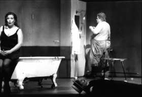 Staatstheater Darmstadt zeigt Schnittke-Oper „Leben mit einem Idioten" Will man an einem sommerheißen Juniabend eine Polit-Parabel auf das bankrotte Sowjetreich hören? Noch dazu eine, in der ein fetter, sexgeiler Debiler mit Kefir, (imaginärem) Kot und anderen Accessoires um sich schmeißt, das Klo aus der Verankerung reißt, die Dame des Hauses vergewaltigt, ihr zum Dank für den Liebesdienst die Rübe mit der Gartenschere vom Rumpf zwiebelt, um sie dann in den Müllcontainer zu stopfen? Nicht wirklich. Starker Tobak, was jetzt am Darmstädter Staatstheater Einzug gehalten hat – in Nachbarschaft zur poesievollen Vivaldi-Oper „Orlando". Aber Theater, so lautet die sozialkritisch bewegte Theorie, soll ja nicht nur schön und fein sein, es soll auch anecken und verstören; soll Traumbilder auch mal zerschlagen. Doch grau ist alle Theorie. Alfred Schnittkes Musiktheater „Leben mit einem Idioten" basiert auf der gleichnamigen Erzählung des russischen Literaten Viktor Jerofejew. In den 80-er Jahren war er mit Publikationsverbot belegt, erst 1992 konnte das von Schnittke vertonte „Requiem auf die Sowjetunion" in Amsterdam uraufgeführt werden. Man kann sich dieses brachiale Kuriosum, zu dem Bühnenbildner Dieter Flimm ein bieder-konkretes Interieur beisteuert, gut auf einer Werkstattbühne vorstellen – in einem Opernspielplan knirscht es wie Sand. Zumindest in Friedrich Meyer-Oertels Regie, die ein wenig mit heißer Nadel gestrickt wirkt: Wowa (Christian Elsner) sagt nur „Äch", auch „Äch-Äch" und ist ein nur gelegentlich komischer Idiot, der den leibhaftigen Proust aus dem Bücherregal reißt. Der Ich-Erzähler und Schriftsteller (stimmlich stark: Thomas J. Mayer), der sich Wowa zur Strafe für seine egoistische Attitüde ins Haus holen musste, bleibt abstrakt. Der Chor klettert auf Leitern umher und ist irgendwie dauernd im Weg, das Ende sackt auch akustisch weg und ist vor dem Hintergrund des Parabelgehalts – ein Plädoyer für gemeinwohlorientiertes Denken – diffus. Absurdes Bürgerschrecks-Theater, das nie so richtig provoziert. Interessant ist Schnittkes collagenhaft-verschachtelte Musik, mit der GMD Stefan Blunier klug umzugehen weiß. Aufführungen: 19., 22., 26. Juni. jb |