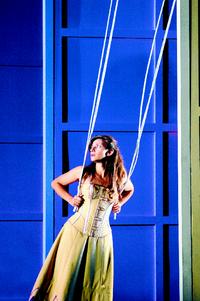 Rossinis "La Cenerentula" an der Oper Frankfurt Von Markus Häfner Zuerst fürchtet man, es sei wieder eine jener Inszenierungen, die die Opernhandlung am Ende als Wunschtraum der Titelfigur zerplatzen lassen. Da ist das verdächtige Bett, in dem Angelina ("La Cenerentola") während der Ouvertüre erwacht und von dem aus sie sich selbst und ihre Umwelt verkleinert, in einer Puppenbühne, beobachtet. Doch Keith Warners neuste "Cenerentola" an der Oper Frankfurt verläuft in weitaus vielschichtigeren Dimensionen; zeigt kein böses Erwachen, sondern ein schrittweises Erstarken der Titelfigur. Warners Regie wirft Rossinis Aschenputtel-Vertonung in ein spannendes Vexierspiel mit verschwimmenden Grenzen zwischen Räumen und Rahmen, Strippenziehern und Marionetten, Wunsch und Wirklichkeit. Die blaue Iris eines riesigen Auges auf dem Bühnenvorhang zieht den Betrachter wie durch einen Tunnel hinein zum Licht und zum abwechslungsreichen Bühnenbild Jason Southgates. Rossini selbst sah seine Buffo-Opern schon als "Komödien über die Komödie" an - Warner greift diesen Gedanken auf, spielt im Theater mit dem Theater Theater: Kalkuliert dabei, dass artifiziell, multipliziert mit artifiziell, nichts andres als die nackte Realität ergibt. Und so ahnt man den ganzen Abend lang das zeitlos Gültige der Handlungsmotive und Charakterzüge hinter aller Maskerade. Musikalisch trumpft diese "Cenerentola" mit einem Orchesterklang auf, dem Roland Böer einen filigranen Rossini-Ton mit sektperlenklaren Dreiklangsbrechungen, wuchtiger Gewittermusik, liebevoll ausgespielten Kadenzschlussformeln und hochkonzentrierten Accelerandi eingeimpft hat. Leider laufen letztere noch nicht immer rhythmisch präzise mit den Gesangsstimmen überein. Außer bei Simon Bailey als Alidoro und Nathaniel Webster (Dandini), die eine rundum brillante Vorstellung abliefern, gerät manche Stretta mit hohem Tempo und hoher Textdichte zur Wackelpartie. Doch je später der Abend desto sicherer die Solisten. Nidia Palacios singt die sehr schwere Titelpartie mit in den Extremlagen enger, insgesamt aber souveräner Mezzosopranstimme, und Gioacchino LiVigni gibt einen am Ende strahlend klaren Don Ramiro. Kein perfekter Opernabend, aber ein sehr sehenswerter. |