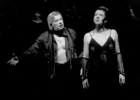 egotrip.de Dezember 2003 "Liebe" im Doppelpack Betrachtet man die Opernliteratur, dann steht das Thema "Liebe" - wie auch in der tonlosen Literatur - mit an vorderster Stelle. Doch meist wird dann ein bestimmter Aspekt - Treue, Entsagung, Eifersucht - über drei bis fünf Akte herausgearbeitet. Selten drängen Librettist und Komponist das Thema auf einen Akt zusammen, entschlacken es sozusagen auf das Wesentliche. Paul Hindemith und Béla Bartók sowie ihre jeweiligen Librettisten August Stramm und Béla Balázs gehören zu dieser seltenen Spezies. In beiden Fällen hat das Duo jeweils einen "Kernaspekt" der Liebe aufgegriffen und in hoch verdichteter Form vertont. Regisseur Friedrich Meyer-Oertel hat in seiner letzten Spielzeit am Staatstheater Darmstadt diese beiden Einakter einander gegenübergestellt und dadurch ein reizvolles Spannungsfeld geschaffen. In "Sancta Susanna" hat sich die Nonne Susanna (Doris Brüggemann) vollständig der Liebe zu Jesus Christus hingegeben. Tag und Nacht betet sie, und selbst ihre Mitschwester Klementia (Elisabeth Hornung) kann sie nicht von der lebensgroßen Skulptur des Gekreuzigten weglocken, um etwas Schlaf zu finden. Die Gottesliebe wird noch durch die Legende einer anderen Nonne verstärkt, die einst eine Jesus-Figur in libidinöser Absicht umarmt haben und dafür lebendig eingemauert worden sein soll. Susanna betrachtet diese Figur eher als Vorbild denn als abschreckendes Beispiel. Als zudem noch durch die warme Mainacht lustvolles Stöhnen eines Liebespaares dringt, gewinnt der immer mitschwingende sinnliche Anteil an der religiösen Liebe die Oberhand. Susanna sieht sich außer Stande, die jungen Leute zu maßregeln, reißt sich die Tracht vom Leibe und zieht die Jesus-Statue auf sich. Als dies die zum Gebet kommenden Nonnen sehen. verdammen sie Susanna unter vorgestreckten Kreuzen als "Satana" In Bartóks "Herzog Blaubarts Burg" dagegen steht von vornherein die Liebe zwischen den Geschlechtern im Mittelpunkt. Judit (Katrin Gerstenberger) verlässt Eltern und Bräutigam, um Herzog Blaubart (Friedemann Kunder) in seine Burg zu folgen, obwohl sie von dem Gerücht gehört hat, dass er dort seine Frauen umbringt. In dem Haus entdeckt sie sieben verschlossene Türen und lässt nicht eher locker, als bis Blaubart ihr mit zunehmendem Widerstreben die Schlüssel einzeln ausgehändigt hat. Hinter einer Tür entdeckt sie Folterkammern, hinter der nächsten Kriegswaffen, eine andere führt zu Gärten, dann eine aufs weite Land des Herzogs. Die vorletzte Tür führt auf einen See aus Tränen - seiner Frauen - und die letzte schließlich, in der Inszenierung Meyer-Oertel als Sarkophag-Deckel ausgebildet, zeigt die bisherigen Frauen als "tote" Abbilder. Die Geschichte ist von hoher Symbolkraft, die Türen stehen für die Abschottung der männlichen Psyche gegenüber der Umwelt, vor allem den Frauen, und das hinter ihnen Verborgene für die Phantasie der Männer: Gewalt, Krieg, doch auch Freiheit und Schönheit, sowie die Frau als leidendes Objekt männlicher Begierden. Die Frauen ihrerseits ruhen nicht, bis sie alle Türen geöffnet haben, und machen dadurch ein Zusammenleben unmöglich- sieh "Lohengrin". So endet auch Judit in diesem Einakter wie die bisherigen Frauen als ein bloßes Erinnerungsbild. Soweit die Handlung. Meyer-Oertel hat diese beiden so verschiedenen und doch so ähnlichen Stücke über die Klammer des Bühnenbildes verbunden. Eine hohe Gazewand trennt den vorderen Bühnenraum von dem rückwärtigen Teil, auf dem erhöht das Orchester unter Leitung von Stefan Blunier sichtbar agiert. Die Musik wird dadurch auch optisch Teil der Inszenierung, was dieser einen zusätzlichen Reiz verleiht. Denn tatsächlich spielt die Orchestermusik eine wesentlichere Rolle als in herkömmlichen Opern, wo sie eine mehr oder minder komplexe Handlung oft nur begleitet oder umspielt. Hier verdichtet die Musik selbst den eindimensionalen Handlungsstrang. "Eindimensional" bezieht sich hier weniger auf die Qualität als auf die Thematik. Die Musik zeichnet die Seelenzustände der Akteure bzw. die "Räume" der männlichen Psyche im Detail nach. Susannas sich steigernde Obsession, der stetige Übergang vom Geistigen zum Sinnlichen bis hin zum finalen Ausbruch finden sich in der Musik wieder, ja, die Gesangspartien stehen deutlich hinter der orchestralen Musik zurück, dienen nur als Korsett für die Handlung. Spielte man diese Einakter ohne Gesang, mit stummen Darstellern, so würde allein die Orchestermusik die Aussage verdeutlichen können. Das gilt auch und vor allem für "Blaubarts Burg", bei der sich die Musik sozusagen "von Tür zu Tür" ändert: die Folterkammer kommt mit drohenden, schmerzlich kreischenden Klängen daher, die Waffenkammer mit deutlichen Anklängen an Militärmusik, Garten und weites Land mit lyrischen und weit ausholenden Motivbögen. Zum Schluss dann fällt die Musik in düsteres Moll, wenn Blaubart wieder alleine davonzieht, die nächste Frau zu suchen. Die handlungsarmen, doch expressiven Libretti verlangt von den Darstellern höchste Konzentration, ist ihnen doch kein Moment Leichtigkeit oder Entspannung vergönnt. In beiden Einaktern steigert sich die Spannung vom ersten Ton bis zur finalen Katastrophe, und diese Steigerung setzen alle Darsteller überzeugend um. Das gilt vor allem für Doris Brüggemann als Sancta Susanna und Katrin Gerstenberger als Judit. Beide haben die jeweils aktiven Rollen mit einer größeren Ausdrucksbreite zu bewältigen, während Elisabeth Hornung als Klementia und Friedemann Kunder als Blaubart eher passive, d.h. reagierende Rollen einnehmen. Im letzteren Fall ließen sich daran noch einige psychologische Betrachtungen über das Geschlechterverhältnis anschließen, diese würden jedoch den Rahmen der Rezension sprengen. Allen Darstellern ist jedoch gemein, dass sie ihre Rollen glaubwürdig und überzeugend ausfüllten. Das Publikum erkannte die Leistung des Ensembles an und brachte dies durch kräftigen Beifal