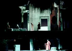 Gioachino Rossini: Maometto II Ce 28 janvier, premier jour du Carnaval 2005, la Fenice affiche l'opéra de Rossini Maometto Secondo qui avait déjà ouvert la saison du Carnaval le 26 décembre 1822. Sur un livret de Cesare della Valle, l'ouvrage a pour thème la prise de la colonie vénitienne d'Eubée, dans la mer Egée, par le conquérant de Byzance, Maometto II. Dans la version créée à Naples en décembre 1820, les troupes vénitiennes, à la tête desquelles Paolo Erisso, gouverneur de l'ïle et son second Calbo, sont massacrées et la fille d'Erisso, autrefois séduite par Maometto II sous l'identité d'un notable chrétien, préfère se donner la mort plutôt que de devenir l'épouse d'un ennemi et d'un infidèle. Rossini, se doutant que l'évocation de cet épisode historique, même romancé, ne les séduirait pas, adapta l'oeuvre au goût de ses contemporains vénitiens. Ajoutant une ouverture selon le modèle opératique en vogue à Venise, il renonça à une structure musicale novatrice pour revenir à un schéma plus traditionnel et, avec l'aide du librettiste Gaetano Rossi, le finale, de tragique, devint joyeux. Dans cette version de la Fenice, jamais reprise depuis 1823, Maometto II accepte le défi que lui lance Calbo, général en chef des Vénitiens et prétendant à la main d'Anna Erisso. Véritable jugement de Dieu, ce combat voit la défaite des Musulmans. Entre son père et son amoureux, Anna chante alors le rondo final de La Donna del Lago.On le voit, de Naples à Venise, on est passé d'une tragédie sanglante à un dénouement des plus conventionnels. Cependant, les beautés musicales sont si nombreuses que ces changements n'affectent pas l'intérêt suscité par la version vénitienne. De surcroît, pour faire de ces représentations un événement, deux spécialistes éminents de Rossini ont été convoqués, vénitiens eux-mêmes, du moins d'adoption. Claudio Scimone, chef d'orchestre et musicologue, auteur de l'édition critique et du premier enregistrement de la version napolitaine il y a plus de vingt ans, a mis au point la version donnée à Venise à partir des autographes existants. C'est dire si cet opéra lui est familier. Quant à Pier-Luigi Pizzi , chargé de la mise en scène, des décors et des costumes, il a signé de très nombreuses productions rossiniennes dans les plus grandes maisons. Avec de tels maîtres d'oeuvre, on ne pouvait se tromper, semblait-il. Et pourtant... Ce n'est pas trahir un secret que de dire que Claudio Scimone est meilleur musicologue que chef d'orchestre. Une direction imprécise et des tempi variables ne facilitent pas la tâche des autres musiciens, instrumentistes ou chanteurs. C'est un peu chacun pour soi. Si, grâce au professionnalisme des uns et des autres, tout accident grave est évité, la cohésion du plateau laisse à désirer et la musique de Rossini n'est pas servie au mieux.Du point de vue visuel, on retrouve l'élégance infaillible de Pizzi. Mais la beauté des décors et des costumes tient-elle désormais lieu de mise en scène ? Devant des ensembles mornes et statiques, aux attitudes incompatibles avec le texte chanté, on ne peut que se demander si cet homme, qui préparait simultanément Ernani à Vérone, Maometto II à Venise et Semiramide à Rome, a consacré assez de temps à diriger les personnages. Certes, chaque décor éveille des réminiscences picturales ou photographiques - le harem où les femmes assemblées composent un ensemble qui évoque celles de Kaboul dans les ruines - le souterrain voûté à la Piranese, la dégradation croissante du temple antique qui sert d'église aux Vénitiens assiégés, le rempart à demi écroulé par lequel Maometto II fait son entrée... Certes, les costumes qui déclinent toutes les nuances du blanc au noir et du grège à l'ocre - un refus des couleurs vives étendu au héros, revêtu de rouges éteints -, les plissés rappelant l'Antiquité et le Vénitien d'adoption Fortuny, tout est raffinement et condensé de culture. Mais la conception et la réalisation n'ont ni le caractère d'évidence ni la force du spectacle donné à Pesaro autour de la version napolitaine, vraisemblablement plus travaillé.La distribution ne réserve pas non plus que des satisfactions. Federico Lepre, en Selim, suivant de Maometto II, tire son épingle du jeu. En dira-t-on autant de Nicola Marchesini, le contre-ténor choisi pour être le général Condulmiero ? S'agissait-il de faire sensation ? En 1822, le rôle était chanté par une basse, et dans son enrichissant essai publié dans le copieux programme de salle, Marco Beghelli suggère, compte tenu de l'état de la partition, de faire appel à un baryton aigu... En passant de Naples à Venise, le rôle de Paolo Erisso, gouverneur malheureux et père déchiré, s'est enrichi d'un air qui en augmente le poids. Le jeune ténor Maxim Mironov, remarqué en novembre au Théâtre des Champs-Élysées en Ramiro, fait de son mieux, mais la tessiture de baryténor se révèle éprouvante et son vibrato donne à croire qu'il est, dès le début, fatigué. En outre, physiquement, bien qu'il essaie de se voûter, on a du mal à croire qu'il soit au moins quadragénaire. Anna Rita Gemmabella interprète Calbo. Le travesti ne sied vraiment qu'aux chanteuses élancées, ce qui n'est pas son cas. Par contre, la voix est sonore, agile et étendue, l'émission assez bien contrôlée - peu de sons engorgés ou dans les joues lors des changements de registre -, mais elle manque un peu de mordant. Le rôle d'Anna Erisso, créé jadis par une Isabella Colbran sur le déclin, revient à Carmen Giannattasio. Charmante comme le dit son prénom, elle a comme son illustre devancière des difficultés dans les aigus, qui frôlent la stridence. La souplesse et la vocalisation n'ont rien sensationnel, et le personnage, toujours appliqué, n'a guère de relief. Heureusement, Lorenzo Regazzo offre au public une leçon de chant rossinien. Assurément