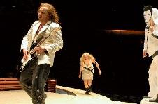 Heino bewacht die Unterwelt Von Michael Dellith Schlampige Arbeit kann man dem jungen Regieteam David Hermann (Inszenierung) und Christof Hetzer (Bühnenbild/Kostüme) wohl kaum vorwerfen. Mit Akribie und Feinsinn haben sie in die Musik Monteverdis hineingehorcht. Sie haben das rhythmische Potenzial aufgespürt, den barocken Drive entdeckt und in Bewegung umgesetzt – ja eine ganze Choreografie entwickelt, die nicht nur die Sänger, sondern auch das Orchester und den Chor miteinbezieht. Und sie haben eine Geschichte erzählt, freilich nicht die vom mythischen Orpheus, sondern eine ins Moderne transferierte: Hermann und Hetzer verwandelten den antiken Sänger in einen abgehalfterten Rockstar, dem die E-Gitarre um die Hüften hängt. Für sie ist Orpheus der Typus des selbstzerstörerischen Musikers, der nur durch Leiden zu seiner genialen Kunst findet – ein Hypersensibler, oft depressiv, der für das "normale" Leben untauglich ist und seine Reise in die Unterwelt als Drogentrip erlebt. Und die Hirten? Die erscheinen als Fan-Kollektiv im uniformen Trainingsanzug. Sie bewundern ihr Idol, hassen und verspotten Orpheus aber auch. Das alles spielt sich auf einem kreisrunden Laufsteg ab, und das Orchester sitzt, eingezäunt wie in einem Gehege, mitten drin. Ein Bühnenbild im herkömmlichen Sinne gibt es nicht. Dafür aber allerhand Action. Nicht nur, dass der Laufsteg fast ohne Unterbrechung rotiert, auch die auftretenden Personen – lauter kaputte Typen im punkigen Outfit – verfallen zum Rhythmus der Musik in unablässiges Zucken und Zappeln, Hüftschwingen und Posieren. Das mag für die Videoclip-Generation erbaulich sein, vom musikalischen Geschehen aber lenkt es ab. Und das ist besonders schade. Denn was Paolo Carignani, der mit dem "Orfeo" seine erste Barockoper dirigiert, dem Ensemble aus Streichern des Frankfurter Museumsorchesters, die auf Darmsaiten spielen, und Bläsern verschiedener Alte-Musik-Formationen an klanglichen Finessen entlockt, ist fabelhaft. Ihm gelingt ein plastisches Klangbild, rhetorisch geschärft, mal lyrisch-sanft, mal aggressiv aufgeraut im Ausdruck. Dabei tanzt Carignani in seiner filigranen und pointierten Zeichengebung die Rhythmen gleichsam mit, lässt die Musik immer vorwärts drängen. Auch sängerisch wird Exquisites geboten. Allen voran steht der gefeierte Liedinterpret Christian Gerhaher, der mit seinem höchst kultivierten Bariton die Gefühlsextreme des traurigen Titelhelden auslotet. Aber auch die Sopranistin Konstanze Schlaud als Euridice und die Mezzosopranistin Arlene Rolph (Messagiera) gestalten ihre Partien mit berückender Intensität. Ralf Simon (Pastore) und die Frankfurter Ensemblemitglieder Nidia Palacios (Proserpina), Britta Stallmeister (La Musica), Anna Ryberg (Ninfa), Florian Plock (Plutone), Michael McCown (Pastore) und Nathaniel Webster (Apollo) demonstrieren Barockgesang auf höchstem Niveau, unterstützt von den exzellent geschulten Sängern des Darmstädter Konzertchors. Bleibt noch Magnus Baldvinsson, der in der Partie des Fährmanns als Heino-Verschnitt die Unterwelt bewacht und von Orpheus eins mit der Gitarre übergebraten bekommt. Ein schöner Gag – das Premierenpublikum jubelte. |