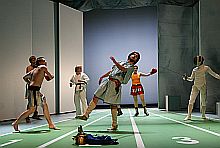 Durchwachsener war da schon die Leistung des jungen Sängerensembles, das nicht nur mit Verzierungen in der Wiederholung der A-Teile der Da-Capo- Arien enorm gefordert war: Vor allem die Mezzosopranistin Jana Kurucová konnte allerdings auf ganzer Linie beglücken - mit einem schillernden Timbre und Gestaltungskunst in der Hosenrolle des Megacle, der für seinen Freund Licida bei den Olympischen Spielen das geliebte Mädchen als Trophäe erringen soll und dabei unwissentlich die eigene Freundin verrät. Fast ebenso überzeugend: Rosa Dominguez als seine Aristea. Auch der - als indisponiert angesagte - Sebastian Geyer setzte seinen agilen, schönen Bariton als Clistene, dem Vater Aristeas, gut ein. Countertenor Alexander Schneider ist kein männlicher Altist der Extraklasse (den könnte sich Heidelberg auch nicht leisten), aber er besitzt eine schöne Tiefe. Allerdings singt er oftmals mit zuviel Druck, was einen runden, schönen Klang beschädigt. (Dass aber nach seiner zweiten Arie ein Zwischenrufer Schmerzensgeld einforderte, war geradezu ein Akt von Vandalismus, der zu Aufruhr im Theater, der ironisch verbitterten Antwort des Dirigenten: "Das ist interaktives Theater!" und einem umso heftigeren Einsatz des folgenden Rezitativs führte.) Werner Pichler hatte relativ kurzfristig die Regie übernommen, sah sich mit vielen Krankenständen im Ensemble konfrontiert und konnte wohl seine Vorstellung nicht immer im Detail umsetzten. Sein Konzept war interessant, wollte er doch die antiken Kämpfer mit Sportlern im Jahr 2007 konfrontieren: Manchmal war dieser Zeitsprung schlüssig, etwa wenn Boxer von heute einen Akteur als Furien peinigen. Nicht ohne Witz wurde die Umkleide junger Muskelprotze auf offener Bühne inszeniert. Fast nackte Olympioniken erstarrten im goldenen Lendenschurz zu Statuen - und mussten sich immer mal wieder genervt die Muskeln lockerten. Lilia Milek wechselte als Amintas, dem Onkel Licidas? als Drahtzieher des Ganzen mit dem Geschlecht auch immer zwischen Antike und Neuzeit. Spannend ist die Personenregie gleichwohl kaum zu nennen, und sie erzählte auch wenig über die Beziehung der Figuren zu einander. Nicht hilfreich war außerdem das Bühnenbild von Klaus Teepe, der zwar versuchte, barocke Muster zu adaptieren, aber mit seiner kargen "Drehprismen-Bühne" und allerlei buntem Tücher-Zauber arg belanglos blieb. Klaus Kalchschmid |