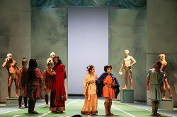 Wenig Bewegung im Sportlercamp Von Matthias Roth Was Adam Fischer mit Mozart in Mannheim oft nur unzureichend realisieren konnte – das „Musikerkarussell" in der Probenphase war nicht zu bremsen – hat nun in Heidelberg mit Vivaldi tatsächlich eine Chance. Ein kleiner Trupp der Philharmoniker hat Gelegenheit, sich unter Anleitung von Fachleuten und ohne Ablenkung mit barocken Geigenbögen, Strichtechniken und Artikulationen sowie Naturhörnern über längere Zeit ausgiebig zu beschäftigen. Das hört man. Unter der musikalischen Leitung von Michael Form zeigen sich die instrumentalen Olympioniken bestens trainiert und medaillenverdächtig gut in Schuss. Man hat begriffen, um was es geht. Im minimalistischen Bühnenbild von Klaus Teepe, das mit bunten Tüchern mehr Verwandlung erreicht als durch die flexiblen, aber kaum zu unterscheidenden Stellwände, erscheint die auf wenige Ideen reduzierte Inszenierung von Werner Pichler letztlich kaum adäquat barock (Kostüme: Frank Bloching). Von hohem Format zeigte sich in der Sängerriege vor allem Jana Kurucová als Megakles, die mit vokalem Glanz und bebender Leidenschaft ihre Rolle gestaltete. Rosa Domínguez’ Aristea, die als Preis dem Sieger der Wettkämpfe gehören soll, Maraile Lichdi als Hirtin Argene und Lilia Mileks Aminthas sind stimmlich ebenfalls ausgezeichnet, und die Sängerinnen schmücken koloraturensicher alle Dacapos mit bravourösen Verzierungen. Die oft atemberaubende Virtuosität der Musik meistern sie mit großem Können und vokaler Leichtigkeit. Besonders bemerkenswert sind bei dieser Heidelberger Produktion die sängerische Einstudierung sowie die Begleitung der Rezitative durch den Cembalisten Marc Meisel und Julian Behr (Theorbe). Das zeigt deutlich: Man ist auf dem richtigen Weg. |
