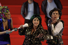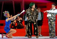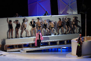 M. Simon (Jeanne Paul) e J. Piland (Maria Maria). Foto Eduard Straub Definita spiritosamente "modische Oper", l'ultima creazione di Giorgio Battistelli è un oggetto strano, quasi bicefalo. Non potrebbe essere partitura più battistelliana nell'articolata concezione musicale, nell'accurata e sontuosa tessitura orchestrale e nella riuscita fusione di materiali eterogenei (c'è anche del jazz), che sul piano vocale spaziano dallo Sprechgesang che spezza il declamato talora arricchito da ensemble che rimandano alle forme chiuse del melodramma tradizionale. Poco battistelliano invece il brillante ma esile libretto (regge appena i 75' di durata del lavoro), ricco di tutti gli stereotipi inevitabili, si direbbe, quando si parla di moda (nemmeno Altman riuscì ad evitarli del tutto nel suo "Prêt-à-porter"). Al centro di "The Fashion" c'è l'ultima sfilata della stilista milanese (!) Maria Maria nell'Hotel Five Seasons. C'è poi la frustrazione della cameriera Meli che, per desiderio di affermazione, si finge modello e ruba a Tarquin, top model e toyboy dell'egocentrica e fragile Maria, scena e amante. C'è, inevitabile, l'ambivalenza sessuale fra Mel/Meli e Maria ma soprattutto Max, il facchino, che le fa il filo da cameriera e che ne è fatalmente attratto anche dalla versione maschile. E c'è infine un'inattesa esplosione di violenza che vira in nero la commedia nel finale. Lo spettacolo di Michael Simon, anche autore della scena fra pop e concettuale, ha la leggerezza e i tempi di un musical e soprattutto resiste all'effetto facile. Cast azzeccato e adeguato fin nei ruoli minori. Da citare le protagoniste Jeanne Piland e Kristen Leich e gli ottimi caratteristi Tony Rizzi e Anton Skrzypiciel come Bow e Scrape. Ottimi gli strumentisti dei Düsseldorfer Symphoniker guidati da John Fiore, che offre una lettura solida e ricca di colori della partitura. Stefano Nardelli |