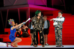 Die Musik Giorgio Battistellis ist da stark, wo sie sich auf den schnoddrigen Text einlässt und auch das Vulgäre nicht scheut. Aber anstatt durchgehend einen „schrägen" Tonfall zu suchen, weicht der Komponist gerne in die Tradition der großen belcantistischen Oper mit ihren großen Gefühlen aus: Mit kantablen Gesangslinien, was auch heißt: mit viel Zeit für den Text. Dadurch nehmen die Übertitel manche sprachliche Pointe vorweg, lange bevor sie ausgesungen ist. Das betrifft vor allem die Partie der Designerin Maria Maria. Große Musikkomödien wie Verdis Falstaff oder Puccinis Gianni Schicchi funktionieren, weil der vorherrschende Parlando-Ton nur an ausgewählten Stellen (dort aber umso effektvoller) von lyrischen Phrasen durchbrochen wird. In Fashion fehlt solche Parlando-Leichtigkeit fast vollständig, und deshalb zündet der ironische Funke nicht. Oft grummelt es in den tiefen Instrumenten, darüber liegt eine dissonant verzerrte, aber immer noch erkennbare Melodie – scharf genug, um modern zu sein, expressiv genug, um sich in die Tradition einzureihen. Diesem Verfahren ist an sich nichts vorzuwerfen, es hat auch in Richard III. funktioniert; aber in der Komödie wirkt es austauschbar, dem Sujet oft nicht angemessen, und auch nicht frei von Abnutzungserscheinungen. Und warum in aller Welt aber komponiert der Traditionalist Battistelli in einer Komödie nicht ein einziges Mal ein richtiges mehrstimmiges Ensemble, was sich von der Story her geradezu aufdrängen würde?
