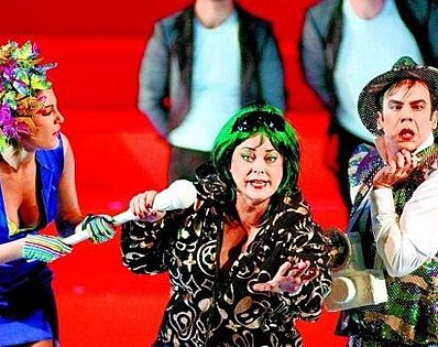 Düsseldorf nimmt sich also musiktheatralisch selbst auf die Schippe? Schön wär's. Mit Lokalkolorit hat Regisseur Michael Simon überhaupt nichts am Hut. Die Kostüme (Stephan Galloway) nehmen den dräuenden Karneval vorweg – schrill, abgefahren, aber ohne jeden Realitäts- oder Zeitbezug. Hier wird nichts parodiert oder karikiert, hier wird im verfremdenden Sperrholz-Bühnenbild vor sich hin geblödelt, mal mehr und mal weniger lustig. Simon hat sich längst einen Personalstil als Markenzeichen zugelegt (unbestimmt abstrakt mit Beleuchtungseffekt oder, wie hier, mit Videoprojektion). Darin zitiert er sich bereits selbst: Die Sitzbank vor weißer Projektionsfläche aus Gounods Faust erscheint hier - diesmal in Schräglage – wieder. Mit Installationskunst ist der bösen Gesellschaftskomödie, die Fashion zumindest vom Text her sein möchte, aber nicht beizukommen. Wenigstens wäre ein halbwegs realistischer Rahmen erforderlich, in dem eine Geschichte erzählt werden könnte. In seiner gezielten Albernheit weckt das Libretto Assoziationen an die britische Komikergruppe „Monty Python"; deren Sketche aber bauen darauf auf, dass eine vordergründig seriöse Situation von Absurditäten unterwandert und schließlich bis zum Kollaps durchsetzt wird. In dieser Inszenierung ist bereits alles zersetzt. Was bleibt, ist mäßige Unterhaltung und phasenweise Langeweile. Geradezu desaströs ist der Schluss, als wolle Simon demonstrativ auf die Schwäche des Librettos hinweisen: Wo die Handlung auf eine große finale Pointe hinausläuft, passiert – nichts. Es steht an dieser Stelle aber auch nichts in Libretto und Partitur, was zu inszenieren lohnte. Die Oper hört einfach auf.