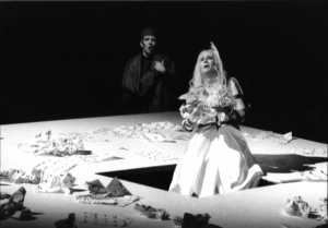 Video-Installationen spielen bei dieser Inszenierung eine wesentliche Rolle. Schon zu Beginn überdecken bewegte Videosequenzen auf dem vorgelagerten Gaze-Vorhang die statischen Szenen auf dem zweiten Vorhang. Später symbolisieren schwimmende Rochen - mancher hat sie anfangs für fliegende Tauben gehalten - die Wanderung der Gedanken über die Entfernung und Galopp-Passagen eines übergroßen Pferdes mit Reiter die Reise. Im Hintergrund erscheinen alte Portraits eines Troubadours oder einer schönen Frau - streng und eindringlich wie im Mittelalter üblich - oder abstrakt-surrealistische Gebilde aus verschlun- genen Figuren und drohenden Wolken symbolisieren phantastische Träume. Das statische Bühnenbild ergänzt die Videos in idealer Weise. Zwei große kubisch-quaderförmige Blöcke charakterisieren Burg und Bühne (des Troubadours), unterschiedlich große, weiße Würfel hängen wie surrealistische Planeten im Bühnenraum als Metaphern für die Einsamkeit des Einzelnen im menschlichen Universum. Die Beleuchtung wechselt je nach szenischer Atmosphäre zwischen warmen Orangetönen - für Clémence -, einem satten Blau als Bild des männlichen Intellekts, expressionistischen Farbspielen bei Gefühls- wallungen und einem fahlen Grau-weiß, wenn Jaufré stirbt. Die Liebesgeschichte selbst verbildlicht die Vergeblichkeit einer fernen Liebe, die sich ein Idealbild von dem Anderen zusammenbaut, das der Realität selten entspricht und zum Ersterben der Liebe beim tatsächlichen Aufeinandertreffen führen muss. Damit wäre jedoch nur eine Interpretation der Geschlech- terbeziehung und ihrer Gefahren gegeben. Über diese eher lebensnahe Deutung hinaus steht der Ablauf des Geschehens jedoch auch für das menschliche Streben nach Erkenntnis. Die Frau symbolisiert dabei die absolute Er- kenntnis dessen, "was die Welt im Innersten zusammenhält", und die Liebe das Streben danach. Erkenntnis des Wahren ist nur zum Preis des Lebens möglich oder "der Weg ist das Ziel". Wenn wir dort angelangt sind, müssen wir sterben, ähnlich Moses, der nach vierzig Jahren angesichts des gelobten Landes seinen Lebenslauf vollendete. Die Darmstädter Inszenierung hat all dies angelegt, ohne eine bestimmte Interpretation plakativ in den Vordergrund zu stellen. Gerade die unprätentiöse aber eindringliche Darstel- lung der Protagonisten und ihrer inneren Ge- fühlswelten eröffneten einen breiten Interpretationsspielraum, ohne deshalb der Gefahr der Unverbindlichkeit zu verfallen. Eine gut erzählte Geschichte spricht für sich selbst und schafft ihren Bedeutungsraum aus sich selbst heraus. Die Darsteller meisterten ihre Rollen durchweg glänzend. Mary Anne Kruger verlieh der Clémence das richtige Maß an Stolz und unerfüllter Sehnsucht. In dieser Rolle konnte sie ihre lyrischen Fähigkeiten besonders gut ausspielen. Hans-Christoph Begemann hatte einen von Emotionen zerrissenen Jaufré darzustellen, der alle Bewusstseinszustände zwischen Sehnsucht, Verzweiflung, Todesangst und höchstem Glück durchläuft. Er wurde dieser Rolle in hohem Maße gerecht und nahm dafür auch von allen Darstellern den größen Beifall entgegen. Katrin Gerstenberger, laut vorheriger Ansage durch eine kurzfristige Erkältung indisponiert, ließ davon allerdings nichts spüren und meisterte ihren Part des Pilgers ebenfalls souverän. Der Chor war von André Weiß war wie immer hervorragend eingestellt und zeigte sowohl stimmliche als auch szenische Sicherheit. Das Orchester unter der Leitung von Stefan Blunier hatte einen besonders schweren Part zu bewältigen, stellt die auf unterschiedlichste Klangfärbungen beruhende Wirkung von Kaija Saariahos Musik doch höchste Anforderungen. Im Gegensatz zur klassischen Musik fehlen feste Takteinteilungen fast völlig und müssen duch erhöhte Aufmerksamkeit und musikalisches Einfühlungsvermögen aller Beteiligten ersetzt werden. Dazu ist den einzelnen Stimmen immer wieder genügend Raum zur Entfaltung ihrer Wirkung einzuräumen. Nicht zuletzt auch die intensive Nutzung von Pausen - eine dauerte fast eine Minute ohne irgend - welche szenischen Aktivitäten - stellten höchste Anforderungen an das Ensemble. Die Musiker wurden diesen Ansprüchen in höchstem Maße gerecht, und Stefan Blunier nahm dafür den verdienten Beifall des Publikums entgegen. Neben ihm und den Darstellern erhielt diesmal - eine Seltenheit - auch die Regie uneinge- schränkten Beifall. Im Rund des Großen Hauses war kein einziges "Buh" zu hören. Einhellig entbot das Publikum dem gesamten Ensemble sowie den ebenfalls anwesenden Kaija Saariaho und Amin Maalouf "standing ovations". In der anschließenden "Talkshow" des Hessichen Rundfunks im Foyer hatten die Zuschauer dann noch Gelegenheit, einigen Ausführungen von Regie, Musik und Autoren zu lauschen und den Beifall noch einmal zu bekräftigen. Copyright für alle Bilder dieser Rezension bei Cornelia Illius |