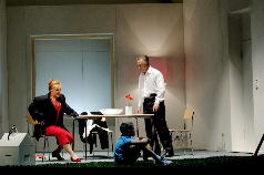 Zu Beginn des dritten Aktes sehen wir Riccardo traurig auf dem kleinen Rasenstück vor dem Fertighaus seines ehemals besten Freundes und Mitarbeiters sitzen, das ebenfalls im Schatten der Wahlplakate und offenbar in einem Hochsicherheitstrakt entstanden ist - ein solch häuslich-familiäres Idyll ist ihm nicht gegeben, der Traum der Liebe mit Amelia funktioniert nicht, die der Wut ihres Gatten ausgesetzt bleibt und vergangenes Glück beschwört, indem sie drei Püppchen ihres Sohnes sich die Hände reichen lässt. Auch der gemeinsame Junge, mit dem beide jetzt abwechselnd spielen, hat schon erhebliches Gewaltpotential: Auf der Schaukel hatte er schon ein Stofftier achtlos zu Boden geworfen, jetzt setzt er Oscar eine Papierkrone auf und antizipiert so den Königsmord seines Vaters, bevor die beiden die Rollen tauschen und somit auch der Anteil am Tod Riccardos vorweggenommen wird, den die indiskrete Assistentin hat.