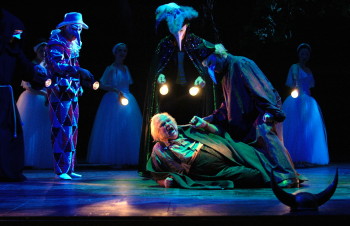 Die deftig-komödiantische Handlung ermöglicht natürlich vielerlei szenische Möglichkeiten für effektvolle Auftritte. Vor allem die Rolle des Falstaff bietet einem Sänger und Schauspieler eine ideale Gelegenheit, alle Register zu ziehen. Saufen, großspurige Reden, Anbandelungsversuche und kräftige Abreibungen haben schon immer das Publikum begeistert, und nicht nur die typischen Zuschauer der "opera buffa". Hier gilt es also aus dem Vollen zu schöpfen und die pralle Lebenslust und auch den plumpen Überschwang mit Tempo und Witz zu inszenieren. Dabei heißt es jedoch aufzupassen, nicht in Plattheit zu versinken und sich nicht auf die gängigen Klischees zu beschränken. In Darmstadt hat Intendant John Dew persönlich die Inszenierung übernommen und auch gleich beim Bühnenbild einen Akzent gesetzt. Dieses besteht im Grunde genommen darin, dass es keins gibt. Auf der nackten Bühne, vor einer ebenso schwarzen und leeren Rückwand und bei offen gelegter Technik der Seitenwände spielt sich das Geschehen mit nur wenigen Requisiten ab. Das Ensemble karrt die Möbel und Requisiten für die jeweiligen Szenen spielerisch selbst heran, und fast möchte man diese Art der Bühnenausstattung als Seitenhieb auf die Sparappelle der Politik auffassen. Angesichts seiner britischen Herkunft wäre John Dews diese Art trockenen Humors durchaus zuzutrauen. Doch der Verzicht auf bühnenbildnerisches Zeitkolorit schadet der Inszenierung durchaus nicht. Tempo und Witz der Aufführung lassen den Mangel an Augenschmaus durchaus vergessen. Dabei verlegt Dew die Handlung durch wenige Handgriffe in die Gegenwart. Der Ehemann von Falstaffs vermeintlicher Geliebten erscheint bei seinem ersten Auftritt als Golfspieler mitsamt Schläger, und die Frauen tauschen die Inhalte der Falstaffschen Liebesbriefe beim Einkauf im Supermarkt aus. Die gefüllten Einkaufswagen erlauben dem einschlägigen Experten sogar gewisse Rückschlüsse auf den Discounter. Dass die drei Damen - Alice Ford, Meg Page und Mrs. Quickley - mit ihrer Kleidung die rot-grün-gelbe Ampelkoalition widerspiegeln, lässt sich als verstecktes Apercu auf die politische Gegenwart deuten (falls da nicht der nackte Zufall wirkt), bilden die drei doch tatsächlich eine ungewöhnliche Koalition, um dem dickfelligen, wohllebigen und uneinsichtigen Patron (das Wahlvolk?) den Marsch zu blasen. Wie dem auch sei, politisch wird dieser Koalition wohl keine Zukunft beschieden sein, dafür siegen die drei Damen auf ganzer Linie, und Alice Ford kann ihrer Tochter Nanetta mit einigen Tricks auch noch den von Vater Ford unerwünschten Fenton als Ehemann zuschanzen. Dagegen führt die nächtliche Szene zurück in eine tiefe deutsche Romantik. Eine riesige Eiche fügt sich aus dem Boden und aus dem Bühnenhimmel majestätisch zusammen, und davor posiert der dickleibige Falstaff (Carlo Hartmann) mit einem gehörnten Helm. Der Berg von Bayreuth lässt unübersehbar grüßen! Der nächtliche Reigen des Chors ergänzt dieses Zitat der Romantik um das damals so beliebte Elfen- und Satyrspiel und gibt obendrein den Damen des Chors die Gelegenheit, sich auch einmal als Tänzerinnen zu beweisen.