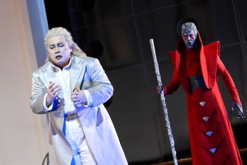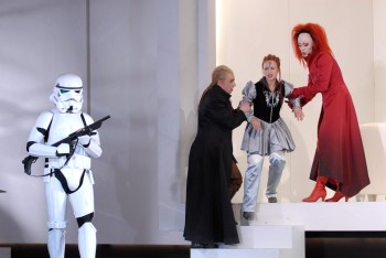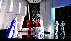 "Star Wars" und Antike treffen sich im Mythos Christoph Willibald Glucks Oper "Iphigénie en Aulide" im Staatstheater Darmstadt Wenn sich der Vorhang zu Glucks Oper hebt, sehen wir Thomas Grubers weit gehend weiße, geometrische und fast puristische Bühnenkonstruktion, die sich nach hinten in allen Dimensionen verjüngt. Über die ganze Rückwand sind auf schwarzem Grund weiße griechische Buchstaben angebracht. Eine dieser Buchstabenkombinationen zeigt eindeutig die Zahl 1939. Kennt man die Ausgangssituation dieser Oper - die bevorstehende Abfahrt der Griechen nach Troja - so sind die Bedeutung und damit auch der erste Bezug auf die heutige Zeit - unverkennbar. Dann jedoch schlägt die Inszenierung die nächste Volte: die Soldaten der Griechen tragen Uniformen wie in "Star Wars" - auch "Krieg der Sterne" genannt: weiße Plastikrüstungen mit futuristischen Helmen, dazu Maschinenpistolen. Diese Aktualisierungen kennt man, allerdings kommen sie hier nicht aufdringlich daher. Agamemnon nämlich, der als erste Hauptperson auf der Bühne erscheint, ist eher zeitlos gekleidet und geht mit seinem weißen Anzug sowohl als griechischer Herrscher wie auch als Sternenkönig der Zukunft durch. Das gilt auch für Calchas, der mit seinem langen roten Mantel mit aufgestelltem Kragen alttestamentarischer Priester und Graue Eminenz einer galaktischen Macht zugleich ist. Klytemnestra, die später mit der unglücklichen Tochter Iphigenie hinzukommt, wird ihrem Ruf als machtbewusste Frau mit aufgeworfenen roten Haaren und schwarzen Anzug gerecht und wird angesichts des bevorstehenden Todes ihrer Tochter zur Furie. Gluck baut seine Oper nach klaren Regeln auf: im ersten Akt zeigt er Agamemnons Entsetzen über die von den Göttern geforderte Opferung seiner ältesten Tochter. Zwischen Staatsraison und Vaterliebe hin und her gerissen, kommt er zu keiner endgültigen Entscheidung, sondern reibt sich an seinem eigenen Schicksal auf. Sein Versuch, Mutter und Tochter wieder nach Mykene zurückschicken zu lassen unter dem Vorwand, Iphigenies Bräutigam Achill sei ihr untreu geworden, scheitert und erweist sich damit als feiger Selbstbetrug. Erst in Aulis erfährt Iphigenie von Achills angeblicher Treulosigkeit, lässt sich von diesem jedoch in einer temperamentvollen Szene von seiner Liebe überzeugen. Als Klytemnestra vom wahren Grund ihrer Anwesenheit in Aulis erfährt, bricht sie in Wut und Hass auf Agamemnon und die Götter aus, kann jedoch nichts ausrichten. Als Agamemnon in einem weiteren Monolog der Zerrissenheit entscheidet, seine Tochter nicht zu opfern, hat diese jedoch unter dem Druck der "öffentlichen Meinung" - das griechische Heer - mittlerweile beschlossen, sich zum Wohle der Griechen zu opfern. Als Calchas schon die Axt am Altar hebt, dringt Achill mit seinen Freunden ein und befreit Iphigenie. In diesem Augenblick tun die Götter über Calchas kund, das sie auf das Opfer verzichten. Am Ende sind alle froh und glücklich, und Iphigenie darf Achill heiraten