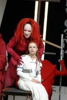 Darmstadt. Beherrschten in „Iphigenie in Aulis" noch helles Licht und eine weiße futuristische Designer-Behausung das Bühnenbild, so verwandelte sich in „Iphigenie auf Tauris" alles ins Dunkle, in eine schwarze Bühnenlandschaft mit müllartigen, schäbigen Überresten aus den letzten Tagen menschlicher Zivilisation. Im Vordergrund Sandsäcke, die Menschen haben sich verbarrikadiert; Es herrscht Krieg. Thomas Gruber hat für die beiden Inszenierungen der Gluck-Opern durch Philipp Kochheim, den Oberspielleiter der Oper im Staatstheater Darmstadt, ein verblüffend raffiniertes Bühnenbild geschaffen. Denn der Zuschauer blickt in „Iphigenie auf Tauris" im Grunde auf die Rückseite der Ausstattung von „Iphigenie in Aulis". Außerdem ist jetzt alles seitenverkehrt. Was in Aulis links war, steht in Tauris rechts. Das ist wie die zwei Seiten einer Medaille. Was vorher edel war, das ist später – die Handlung auf Tauris spielt 15 Jahre nach Aulis – heruntergekommen: also vorne hui, hinten pfui. Oder noch mehr auf die Menschen zugeschnitten: Was zuvor noch Zivilisation genannt werden kann, ist jetzt zur Barbarei verkommen. Wenn wir an die Entwicklungen in Irak denken, und mit welchen nicht eben zivilisatorisch zu nennenden Mitteln die USA an Informationen zu gelangen suchen, kommt derlei bekannt vor. Die Barbarei ist die andere Seite der Zivilisation. Nein, die Geschichte mit Iphigenie geht nicht gut aus. In Aulis soll sie den Göttern geopfert werden, damit die Flotte freie Fahrt zum Krieg mit Troja hat. Weil Iphigenie selbst zum Opfer bereit ist, kommt sie durch göttliche Macht wieder frei, sie hat sich somit aber auch selbst befreit. Sie gelangt kurz darauf auf die Insel Tauris. Dort, im Lande der barbarischen Skythen, begegnen wir Iphigenie wieder. Thoas, der Herrscher auf Tauris, hat Iphigenie beauftragt, jeden Fremden zu töten, der an Land kommt. Just ihren Bruder hat es mit seinem Freund Pylades dorthin verschlagen. Kochheim ändert hier das bei Gluck vorgesehene Happy-End ab. Thoas, im Kampf mit Orest und Pylades unterlegen, stellt sich tot, um dann hinterrücks die beiden Freunde zu meucheln, und schnappt sich höhnisch lächelnd, voll Triumph Iphigenie. Die triumphierende Musik des Komponisten Christoph Willibald Gluck (1714–1787) ist in dieser Inszenierung nur noch blanker Hohn und bricht am Ende einfach ab. Davor hat der Regisseur genau hingehört, denn die Inszenierung korrespondiert mit der Komposition. Tatsächlich klingt die 1774 in Paris uraufgeführte „Iphigénie en Aulide" heller, weicher, trotz aller Schroffheiten und Kühnheiten in der Harmonik, während die 1779 ebenfalls in Paris uraufgeführte „Iphigénie en Tauride" ungleich härter, dunkler, martialischer, dramatisch komprimierter und zugespitzter klingt. Generalmusikdirektor Stefan Blunier am Dirigentenpult arbeitet mit dem glänzend aufgelegten und der historischen Spielweise verpflichteten Orchester, angereichert durch alte Blasinstrumente, diese beiden Sphären nachdrücklich heraus. Wunderbar ein lyrisch tragendes Oboensolo in der aulischen Iphigenie, während in der taurischen Iphigenie sich kriegerisch laute und knallharte Paukenwirbel in den Vordergrund schieben. Die Darmstädter Version stützt sich auch auf die französische Fassung; dazu wird am oberen Bühnenrand die deutsche Übersetzung eingeblendet. Ohne große Reibungsverluste hat der Regisseur die Geschichte beider Iphigenien in die Science-Fiction-Zukunft irgendwo in der Galaxis verlegt. Wie George Lucas in den „Star Wars" blendet der Filmfan Kochheim jeweils zu Beginn die Schriftzüge „Es war einmal vor langer Zeit in einer weit, weit entfernten Galaxis" ein. Die Kostüme von José Manuel Vázquez bedienen sich eifrig bei den „Star Wars", und zwei fesche Girlies scheinen „Tomb Raider" entsprungen zu sein. Alleine diese galaktischen Kostüme und das schicke futuristische Bühnenbild bewirken schon genug Effekte. Hinzu kommt, dass die Maskenbildnerei ganze Arbeit geleistet hat. Man kann die Darsteller kaum wiedererkennen. Und die barbarischen Krieger und Sklaven auf Tauris sehen aus wie Frankensteins Brüder. Wie der Film von Lucas bezieht sich auch Kochheim mit seinen Ausstattern auf die Vergangenheit und liefert so einen Verschnitt aus Fantasy und Science Fiction, aus Antike, 18. Jahrhundert und Zukunft. Wobei die Stimme der Göttin aus einem helmartigen Raumfahrzeug flimmernd ertönt – eine eigens produzierte Aufnahme des Staatstheaters scheppert und knistert wie eine alte Schallplatte. Bewundernswert, wie Susanne Serfling die noch junge aulische Iphigenie gestaltet, wie sie die Nuancen abwägt, mit den Tiefen und Höhen fertig wird, dabei noch immer in Stimme wie Darstellung geschmeidig und wendig bleibt und ihre ausdrucksfähige Strahlkraft wirken lässt. Eine Sängerin, die wohl eine vielversprechende Karriere vor sich haben dürfte. Nicht ganz so unbefangen und jugendlich geht Anja Vincken als taurische Iphigenie mit ihrer Stimme um, die manchmal angestrengt wirkt, weil sie zu sehr ihren Gesang von der hinteren Mundpartie her ausführt. Sobald ihr Sopran mehr vorne ansetzt wird er klarer und ausbalancierter. Besonders schön ist ihre Stimme im gedämpfte Tonfall (sotto voce). Fulminant, wie Tito You das Hin- und Hergerissensein des zweifelnden Agamemnon mit seiner Belcanto-Stimme ausstattet. Faszinierend, wie Katrin Gerstenberger als Klytämnestra den Stimmfachwechsel zum dramatischen Sopran nachvollzieht und alle Lagen mit gesanglicher Intensität abfedert und nur noch als betrunkene Herrscherin das Schicksal erträgt – ein Kabinettstückchen ihrer Darstellungs- und Gesangskunst. Mark Adler hat sich als Achill mit einer sicher sitzenden wie besonders in den tieferen Lagen fein und volltönenden Tenorstimme empfohlen. Ein beachtlicher Sänger-Darsteller, der mit einer Ohrfeige Iphigenie zur Räson bringen will, weil er meint, sie sei übergeschnappt, wenn sie sich freiwillig opfere. Mit facettenreicher Stimme vers