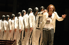 Rocksänger in kreativem Wahn Das Erstaunliche ist, dass diese unkonventionelle, bei vordergründiger Betrachtung zugegebenermaßen platt erscheinende Regie-Idee aufgeht. Jedenfalls hat der junge Regisseur David Hermann der Handlung der „Favola in Musica" keineswegs Gewalt angetan, als er den Titelhelden in Claudio Monteverdis Oper L'Orfeo im März 2005 für die Oper Frankfurt im Rocksänger-Outfit samt E-Gitarre in die Unterwelt schickte. Bei der Wiederaufnahme der Produktion im Bockenheimer Depot war eindringlich zu erfahren, wie aus dem mythisch-antiken Halbgott durch die konsequente Modernisierung ein Mensch von heute wird. Allerdings kein Durchschnittstyp, sondern ein extremer Künstler, der seine Höllenfahrt in kreativem Wahn erlebt. Umgeben ist Orfeo in Hermanns Inszenierung von einer verrückten Fan-Gemeinde, einer gesichtslosen, weiß uniformierten Masse. Diese Fans, im Original Hirten und Geister, brauchen bei ihrem eigenen Mangel an Originalität und Individualität ein Idol zum Anhimmeln, eine Projektionsfigur. Anfangs huldigen sie so ihrem Superstar. Doch drehen sie durch, als er seine Liebe ganz Euridice schenkt. Eifersüchtig und schadenfroh gönnen sie ihm sein Leid, als er von Euridices Tod erfährt und sie aus der Unterwelt herausholen will. Die einprägsamsten Szenen spielen sich am Tor zur Unterwelt und drinnen ab. Als Hades-Wächter Caronte versperrt Schlagersänger Heino (treffend kehlig-finster und roboterhaft: Magnus Baldvinsson) den Weg. Und die „Fans" begrüßen Orfeo mit Masken von Elvis Presley, John Lennon, Jimi Hendrix und anderen Rockgrößen. Alles steht und fällt aber mit der Titelfigur, der einzigen großen Partie. Christian Gerhaher ist dafür eine Idealbesetzung. Mit seinem flexiblen, lyrischen, im Umgang mit Alter Musik erfahrenen Bariton gestaltet er, wie in der Premierenserie, facettenreich und leidenschaftlich, stets stilgerecht und klar artikulierend im „recitar cantando". Zudem macht er darstellerisch deutlich, wie sich das Geschehen nur als „Trip" in seinem Kopf abspielt. Das Orchester, das in der Mitte des genial-einfachen Bühnenbilds von Christof Hetzer, eines drehbaren Holzrondells, sitzt, musiziert unter der Leitung von Studienleiter Felice Venanzoni griffig und farbenreich in historischer Aufführungspraxis. GUIDO HOLZE |