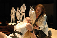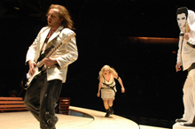 Exzessiv leben und früh sterben Aparte Vorstellung vom Eingang zur Unterwelt: Dort wartet Heino. Ein Double des blonden Barden mit der dunklen Brille stellt sich Orpheus in den Weg. Aus dem antiken Sänger ist ein nicht mehr taufrischer Rockstar geworden, der seine E-Gitarre bei sich trägt. So aktualisierte Regisseur David Hermann vor drei Jahren Claudio Monteverdis "L'Orfeo", jetzt in revidierter Fassung wieder an der Oper Frankfurt. Auch bei der Wiederaufnahme im Bockenheimer Depot war der Auftritt von Bass Magnus Baldvinsson als Heino-Double in Gestalt des Fährmanns Charon ein amüsanter Höhepunkt. Man lebt exzessiv und stirbt früh, das mag für Künstlermilieus der Antike wie der Moderne gelten. Schließlich ist es Eurydikes früher Tod, der in der 1607 uraufgeführten italienischen Oper den Sänger ins Totenreich treibt. Ein Brückenschlag: In Frankfurt halten sich die neun Madrigalisten zwischenzeitlich Masken von Künstlern wie Elvis Presley oder John Lennon vor, die mit frühem Tod moderne Mythen begründeten. Dies korrespondiert mit dem antiken Orpheus-Mythos durchaus erfrischend; dass Monteverdis Musik unangetastet, historisch gut informiert und erfrischend verzierungsreich gespielt wird, garantiert Studienleiter Felice Venanzoni: Das Orchester, Mitglieder des Museumsorchesters und Gäste, steht auf der Bühne im Mittelpunkt, die Inszenierung spielt sich rings um die Musiker ab - eine sinnvolle Anlage für diese erste Oper der Musikgeschichte. Wie bei der Premiere wird im Wiederaufnahme-Zyklus die Partie des Orpheus von Bariton Christian Gerhaher gesungen. Der versierte Liedsänger ist eine Idealbesetzung für die umfangreiche, sehr dominante Titelpartie, mit sauberer Stimmführung selbst in tenoralen Höhen, in lyrischen Momenten hinreißend einfühlsam, leicht und wendig in den Verzierungen: Gerhaher und Venanzoni tragen die Produktion bestens, unterstützt von einem Vokalensemble, in dem Marie Smolka (Eurydike) nur eine von wenigen ist, die bei der Premiere noch nicht dabei waren. Auch Arlene Rolph als allegorische Figur der Hoffnung (Speranza) und Britta Stallmeister als Verkörperung der Musik (Musica) werten diese moderne Sicht auf den Mythos sängerisch auf. AXEL ZIBULSKI |