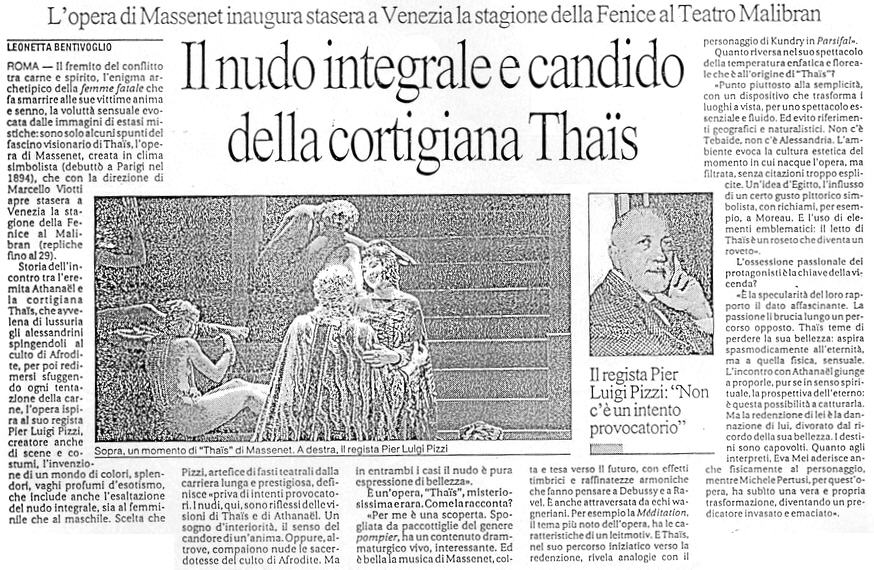 Alla Fenice la ripresa del fortunato allestimento dell'opera di Massenet Venezia. "Thaïs" di Jules Massenet torna alla Fenice giusto cent'anni dopo la sua prima rappresentazione a Venezia nella stagione di Carnevale del 1907-1908, ma a soli cinque anni di distanza dalla fortunata inaugurazione della stagione 2002-2003 al Malibran in attesa della ricostruzione del teatro di campo San Fantin. Fu una "Thaïs" che deliziò pubblico e critica con il compianto Marcello Viotti, allora neo direttore musicale della Fondazione, sul podio; con un nuovo allestimento di Pier Luigi Pizzi che ne curò regia, scene e costumi; con la coreografia di Gheorghe Jancu; con Eva Mei nel ruolo della protagonista e Michele Pertusi in quello di Athanaël. Una "Thaïs" sensuale, lussuriosa, un po' scandalosa e iconoclasta. Una vicenda di sesso e religione che ben si inserisce in quel filone esotico che caratterizzò il teatro musicale nella Francia dell'Ottocento: il romanzo di Anatole France, da cui è tratto il dramma lirico in tre atti e sette quadri scritto da Louis Gallet, racconta la storia di una sacerdotessa di Venere che Dante non aveva esitato a definire "puttana" e "sozza e scapigliata fante" la quale, finita all'inferno nonostante la conversione, "si graffia con l'unghie merdose". E domenica alle 19 quell'allestimento viene riproposto al pubblico veneziano e internazionale che frequenta la Fenice come ottavo appuntamento della stagione lirica con la sola differenza di Emmanuel Villaume in veste di maestro concertatore e direttore e di un rinnovato cast artistico. Ritroveremo in scena le sei danzatrici seminude che (senza alcuna volgarità) danno corpo alle fantasie erotiche che agitano i protagonisti e i tanti simbolismi con cui Pizzi ha farcito lo svolgersi della storia. Se l'allestimento, dunque, non è un mistero come affronterà musicalmente "Thaïs" il maestro Villaume? "Nella mia carriera ha fatto molto Massenet, ma è la prima volta che mi trovo a fare una "Thaïs" con gente che l'ha già fatta - premette il maestro - È un'esperienza molto interessante: a partire dal lavoro con Pier Luigi Pizzi, il quale ha una conoscenza assolutamente geniale di questo repertorio francese, alle scene, che erano state costruite per il Malibran dove il palcoscenico è più piccolo, ma funzionano molto bene anche qui in Fenice". "Per me nella "Thaïs" è molto importante la contrapposizione tra la ricerca metafisica, religiosa di un senso di vita e la sensualità, l'erotismo straordinario - spiega ancora il maestro Villaume - Massenet nelle sue opere era molto interessato a questi due elementi e le scene religiose erano un esercizio nel quale un buon compositore francese doveva cimentarsi nel gran operà. Stilisticamente è una scrittura di musica quasi religiosa e un'espressione autentica, generosa, dolce della sensualità, della passione. E questo contrasto lo si trova anche tra scene grandiose e scene più intime, piene di poesia, sentimento e colori. Allora, con un cast molto bravo e un maestro come Pizzi, proviamo a equilibrare tutto questo giocando su tutti questi colori e pensando a ogni scena come a un quadro". Orchestra e coro della Fenice saranno, dunque, diretti da Emmanuel Villaume ; regia, scene e costumi sono di Pier Luigi Pizzi; la coreografia di Gheorghe Jancu; light designer Sergio Rossi; Darina Takova sarà Thaïs, Simone Alberghini Athanaël, Letizia Giuliani la prima ballerina. Si replica martedì, giovedì e martedì 30 alle 19, sabato 27 alle 15.30. Giuseppe Tedesco |