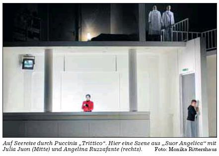 Frankfurt am Main TRITTICOMord, Selbstmord, Betrug. Es geht kriminell zu in Puccinis Opern-Trilogie Il trittico. 3 Kurz-Opern zum Jahresanfang. Ein Fest mit überwältigenden Sängerleistungen. Zeljko Lucic erweist sich als hinreißender Komödiant in Gianni Schicchi, dem Schlussteil, in dem ein gerissener Gauner erbgeile Hinterbliebene ums Erbe prellt. Irre witzig. Anfangs, als düsterer Seineschiffer in Der Mantel, ermordet er den Liebhaber seiner Frau. Nachdem Elza van den Heever und Carlo Ventre ausgiebig in verwehrtem Liebesglück schwelgten. Das Bühnenbild ist schön, aber falsch. Kreuzfahrtschiff statt Schleppkahn, es stimmt auch später nicht, macht aber zunehmend Sinn, wird zu Puccinis Totentraumschiff. Im Mittelteil geht Schwester Angelica, für Fehltritt büßende Nonne in den Tod, als sie von böser Tante erfährt, ihr Sohn sei vor Jahren gestorben. Angelina Ruzzafante, kurzfristig eingesprungen, singt mit Inbrunst, wird zur Königin des Abends. An ihrer Seite brilliert Julia Juon als böse Alte. Optisch ein Genuss, musikalisch brillant, stimmig inszeniert. Das Orchester unter Nicola Luisotti wächst über sich hinaus. Berechtigter Jubel. Wertung: TOLLJosef Becker |